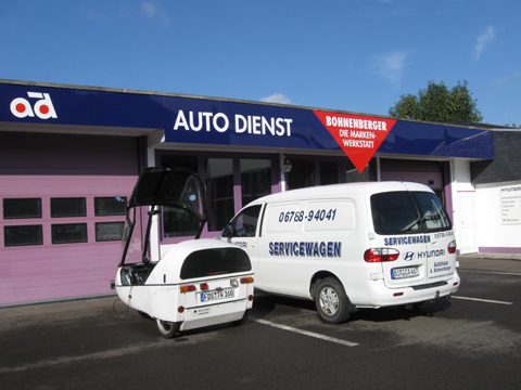 Aufladen in einer Hyundai-Werkstatt im Nahetal. Allmählich setzt sich die Erkenntniss durch, dass der Elektroantrieb kommt. Der Inhaber zeigt sich sehr interessiert und lässt sich die TWIKE-Technik erklären. Während der Frühstückspause lädt er mich noch zu einer Tasse Kaffee ein. |